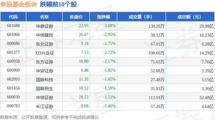 从资金流向上来看,当日参股基金板块主力资金净流出18.82亿元,游资资金净流入9.58亿元,散户资金净流入9.23亿元。参股基金板块个股资金流向见下表: