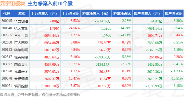 从资金流向上来看,当日元宇宙板块主力资金净流出14.61亿元,游资资金净流入2.19亿元,散户资金净流入12.42亿元。元宇宙板块个股资金流向见下表: