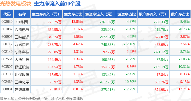 从资金流向上来看,当日光热发电板块主力资金净流出1.95亿元,游资资金净流入2601.9万元,散户资金净流入1.69亿元。光热发电板块个股资金流向见下表: