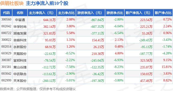从资金流向上来看,当日供销社板块主力资金净流出7723.79万元,游资资金净流出3210.11万元,散户资金净流入1.09亿元。供销社板块个股资金流向见下表: