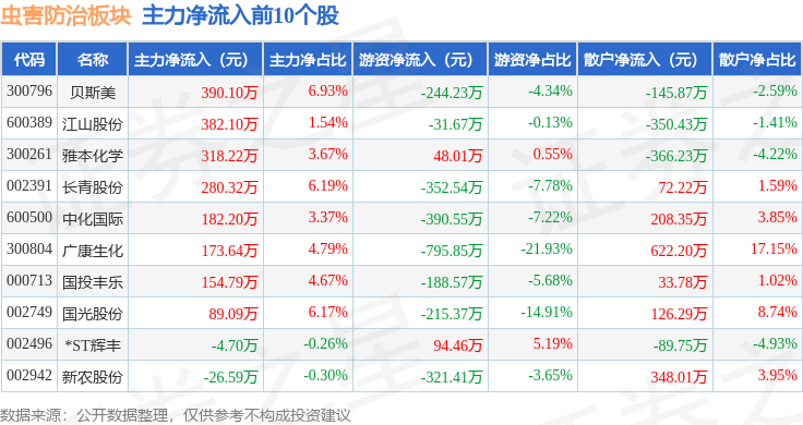 从资金流向上来看,当日虫害防治板块主力资金净流出6755.8万元,游资资金净流出740.12万元,散户资金净流入7495.92万元。虫害防治板块个股资金流向见下表: