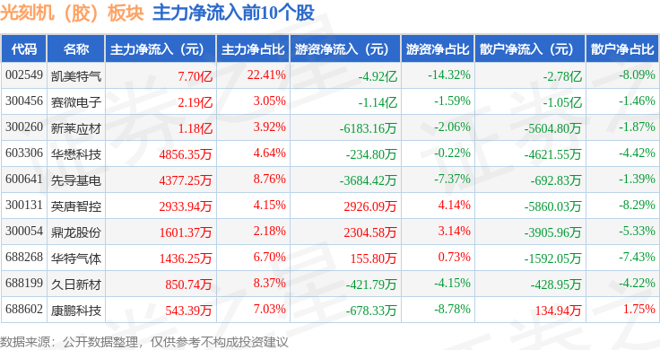 从资金流向上来看,当日光刻机(胶)板块主力资金净流出12.13亿元,游资资金净流出2.21亿元,散户资金净流入14.35亿元。光刻机(胶)板块个股资金流向见下表: