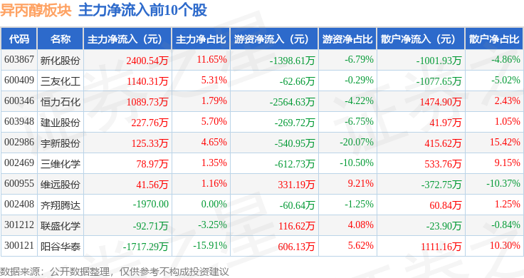 从资金流向上来看,当日异丙醇板块主力资金净流出3.35亿元,游资资金净流出5720.03万元,散户资金净流入3.92亿元。异丙醇板块个股资金流向见下表: