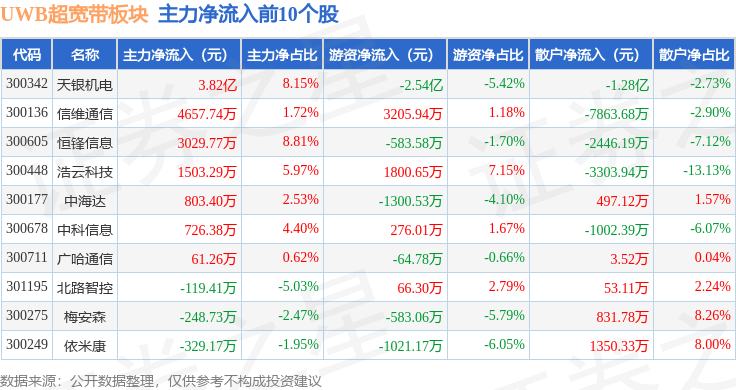 从资金流向上来看,当日UWB超宽带板块主力资金净流出4.85亿元,游资资金净流出8270.99万元,散户资金净流入5.68亿元。UWB超宽带板块个股资金流向见下表: