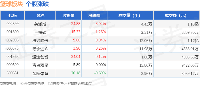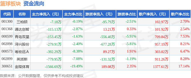 从资金流向上来看,当日篮球板块主力资金净流出3294.59万元,游资资金净流出1169.23万元,散户资金净流入4463.82万元。篮球板块个股资金流向见下表: