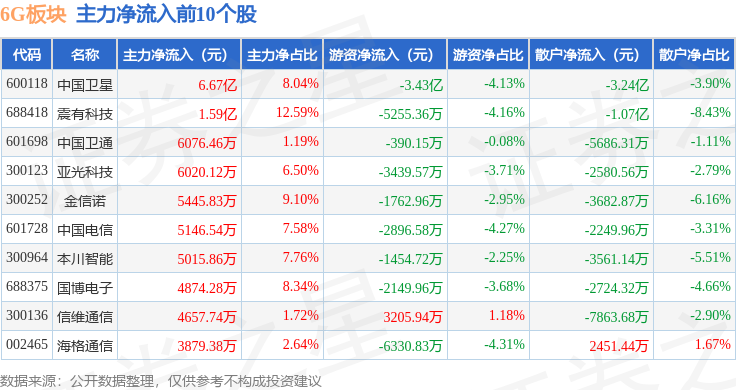 从资金流向上来看,当日6G板块主力资金净流出5.19亿元,游资资金净流出1255.31万元,散户资金净流入5.32亿元。6G板块个股资金流向见下表: