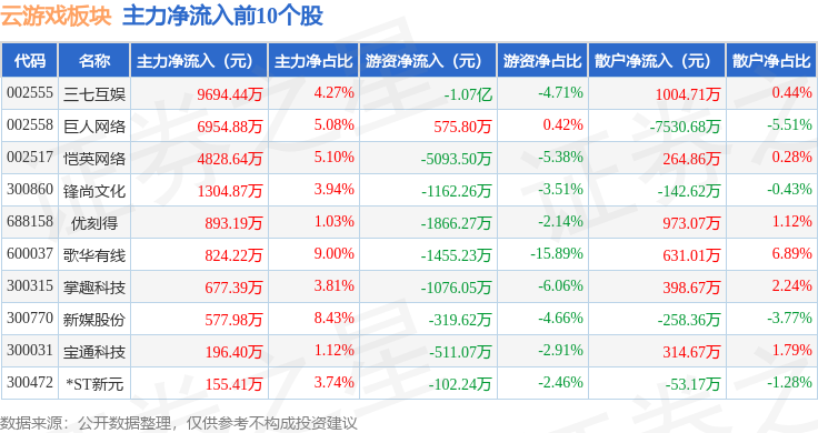 从资金流向上来看,当日云游戏板块主力资金净流出4.98亿元,游资资金净流入9764.51万元,散户资金净流入4.01亿元。云游戏板块个股资金流向见下表: