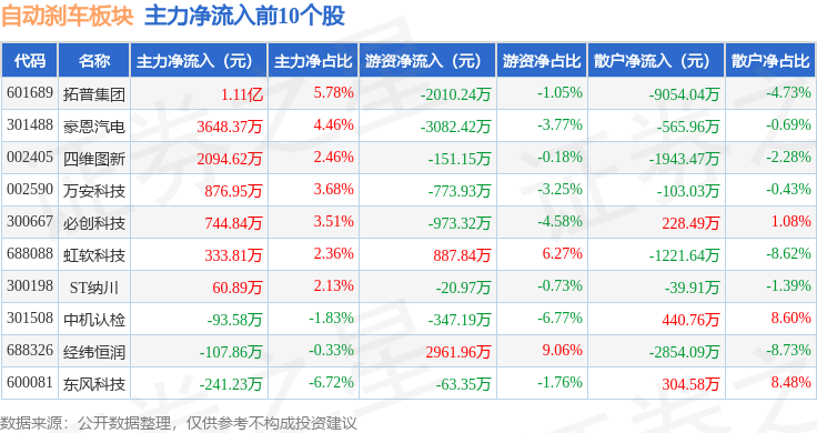 从资金流向上来看,当日自动刹车板块主力资金净流出1.79亿元,游资资金净流出3198.86万元,散户资金净流入2.1亿元。自动刹车板块个股资金流向见下表: