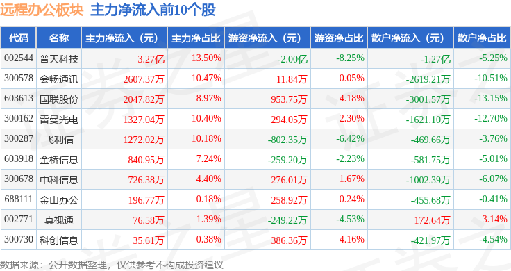 从资金流向上来看,当日远程办公板块主力资金净流出3.67亿元,游资资金净流出1.51亿元,散户资金净流入5.18亿元。远程办公板块个股资金流向见下表: