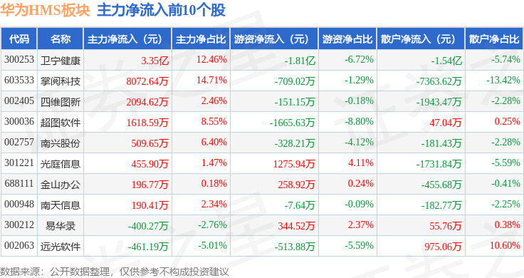 从资金流向上来看,当日华为HMS板块主力资金净流入1.14亿元,游资资金净流出1.81亿元,散户资金净流入6729.95万元。华为HMS板块个股资金流向见下表: