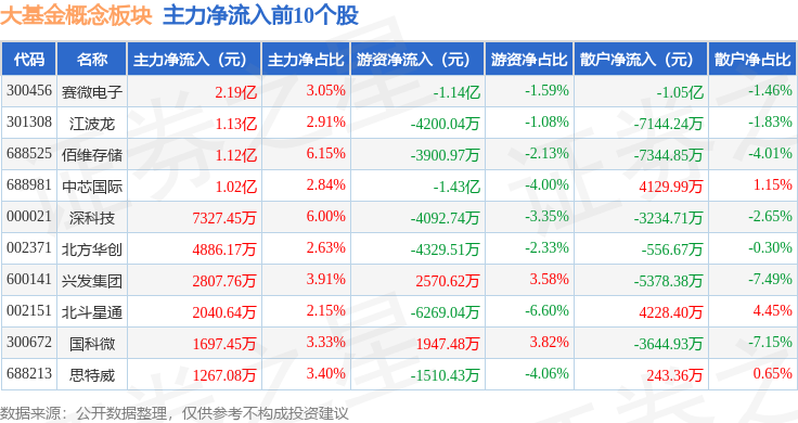 从资金流向上来看,当日大基金概念板块主力资金净流出13.77亿元,游资资金净流入652.62万元,散户资金净流入13.71亿元。大基金概念板块个股资金流向见下表: