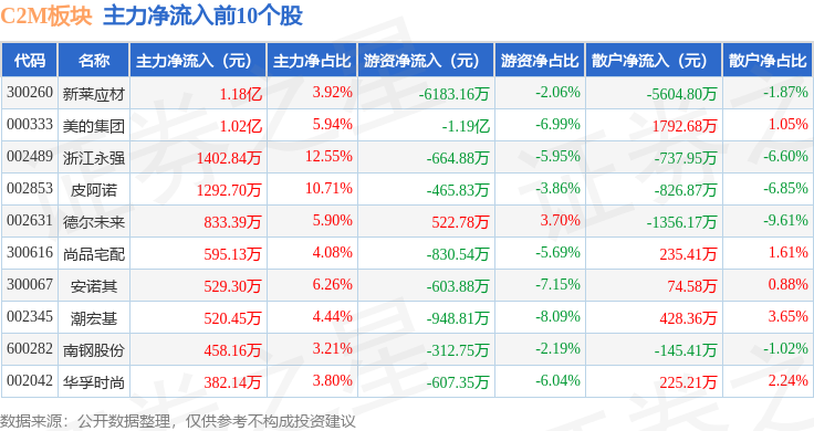 从资金流向上来看,当日C2M板块主力资金净流出8287.62万元,游资资金净流出1.95亿元,散户资金净流入2.78亿元。C2M板块个股资金流向见下表: