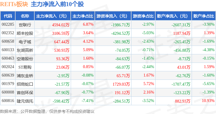 从资金流向上来看,当日REITs板块主力资金净流出3.98亿元,游资资金净流入7297.55万元,散户资金净流入3.25亿元。REITs板块个股资金流向见下表:
