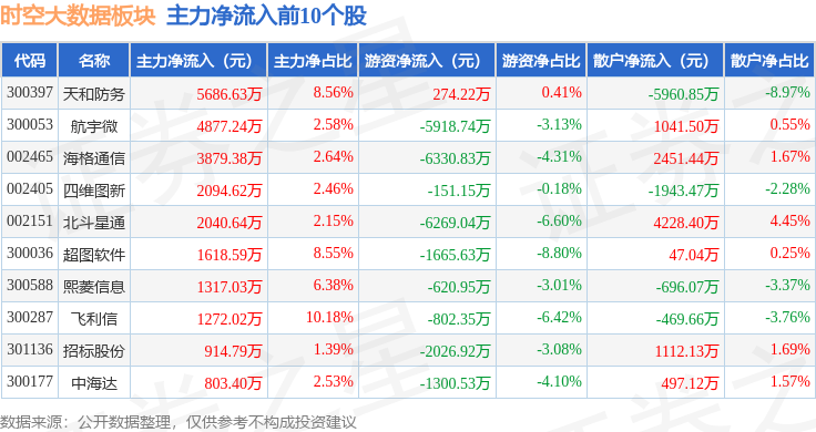 从资金流向上来看,当日时空大数据板块主力资金净流入5696.06万元,游资资金净流出2.59亿元,散户资金净流入2.02亿元。时空大数据板块个股资金流向见下表: