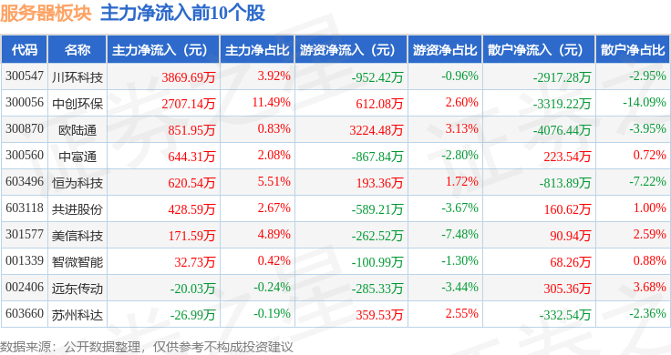 从资金流向上来看,当日服务器板块主力资金净流出47.89亿元,游资资金净流入12.55亿元,散户资金净流入35.33亿元。服务器板块个股资金流向见下表:
