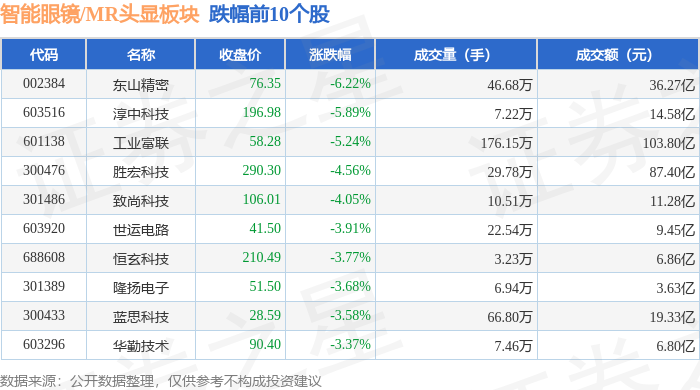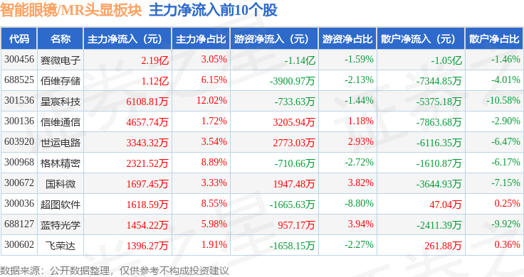 从资金流向上来看,当日智能眼镜/MR头显板块主力资金净流出66.04亿元,游资资金净流入18.78亿元,散户资金净流入47.27亿元。智能眼镜/MR头显板块个股资金流向见下表: