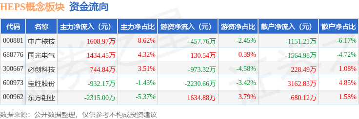 从资金流向上来看,当日HEPS概念板块主力资金净流入541.08万元,游资资金净流出1896.32万元,散户资金净流入1355.25万元。HEPS概念板块个股资金流向见下表: