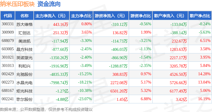 从资金流向上来看,当日纳米压印板块主力资金净流出7.78亿元,游资资金净流入2.08亿元,散户资金净流入5.71亿元。纳米压印板块个股资金流向见下表: