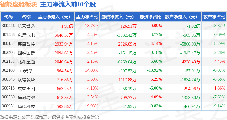 从资金流向上来看,当日智能座舱板块主力资金净流出8.52亿元,游资资金净流入2.89亿元,散户资金净流入5.63亿元。智能座舱板块个股资金流向见下表: