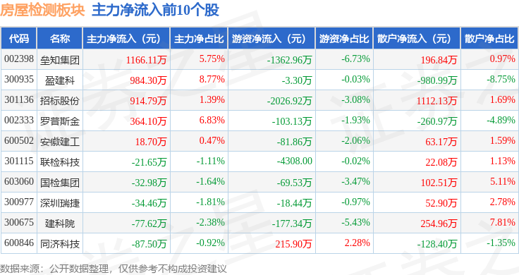 从资金流向上来看,当日房屋检测板块主力资金净流出8837.53万元,游资资金净流出1097.51万元,散户资金净流入9935.04万元。房屋检测板块个股资金流向见下表: