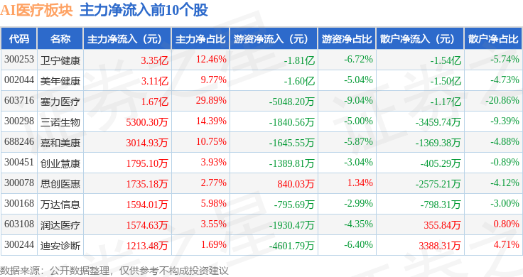 从资金流向上来看,当日AI医疗板块主力资金净流入9.41亿元,游资资金净流出5.16亿元,散户资金净流出4.25亿元。AI医疗板块个股资金流向见下表:
