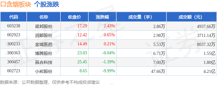 证券之星消息,12月18日口含烟板块较上一交易日下跌1.02%,小崧股份领跌。当日上证指数报收于3876.37,上涨0.16%。深证成指报收于13053.98,下跌1.29%。口含烟板块个股涨跌见下表: