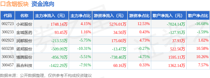 从资金流向上来看,当日口含烟板块主力资金净流出1160.03万元,游资资金净流入4794.39万元,散户资金净流出3634.36万元。口含烟板块个股资金流向见下表: