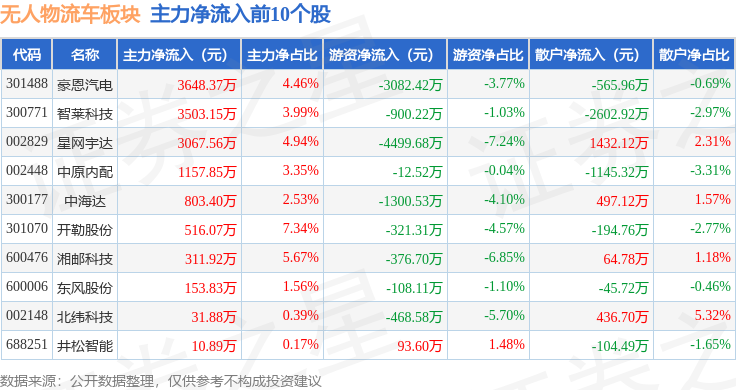 从资金流向上来看,当日无人物流车板块主力资金净流出2.57亿元,游资资金净流出5297.63万元,散户资金净流入3.1亿元。无人物流车板块个股资金流向见下表:
