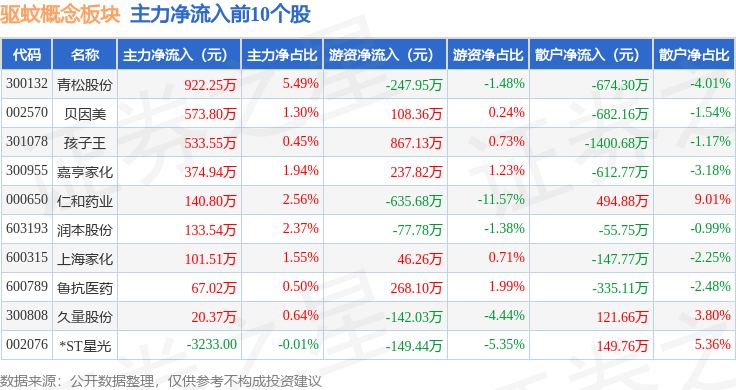 从资金流向上来看,当日驱蚊概念板块主力资金净流出5041.88万元,游资资金净流入198.65万元,散户资金净流入4843.23万元。驱蚊概念板块个股资金流向见下表: