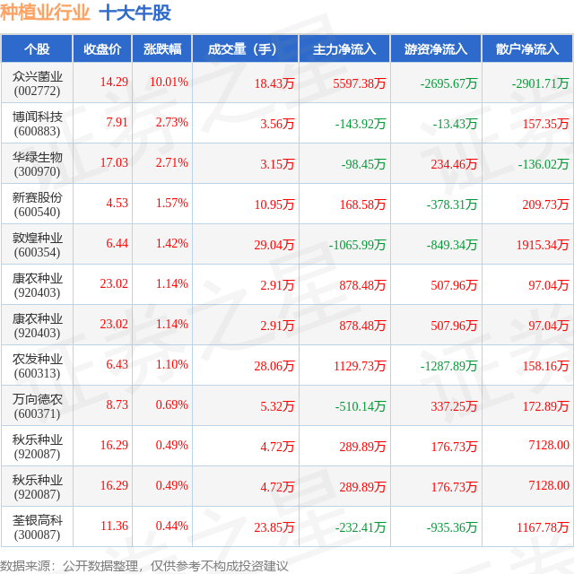 个股表现方面,种植业行业当日领涨股为众兴菌业(002772),该股当日报收14.29,上涨10.01%,成交量18.43万,主力资金净流入5597.38万元。博闻科技(600883)以上涨2.73%紧随其后,该股当日成交量3.56万,主力资金净流出143.92万元。除此之外,华绿生物(300970)、新赛股份(600540)、敦煌种业(600354)均进入当日牛股之列。具体个股列表见下表: