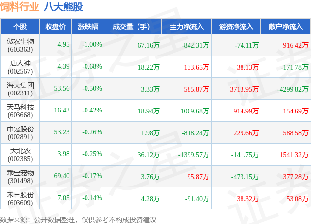 个股表现方面,饲料行业当日领跌股为傲农生物(603363),该股当日报收4.95,下跌1.0%,成交量67.16万,主力资金净流出842.31万元。唐人神(002567)以下跌0.68%紧随其后,该股当日成交量18.22万,主力资金净流入133.65万元。除此之外,海大集团(002311)、天马科技(603668)、中宠股份(002891)均进入当日熊股之列。具体个股列表见下表: