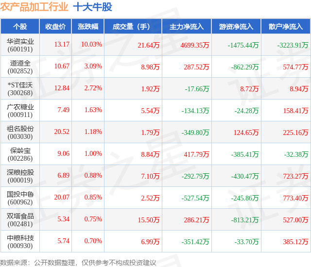 个股表现方面,农产品加工行业当日领涨股为华资实业(600191),该股当日报收13.17,上涨10.03%,成交量21.64万,主力资金净流入4699.35万元。道道全(002852)以上涨3.09%紧随其后,该股当日成交量8.98万,主力资金净流入287.52万元。除此之外,*ST佳沃(300268)、广农糖业(000911)、祖名股份(003030)均进入当日牛股之列。具体个股列表见下表: