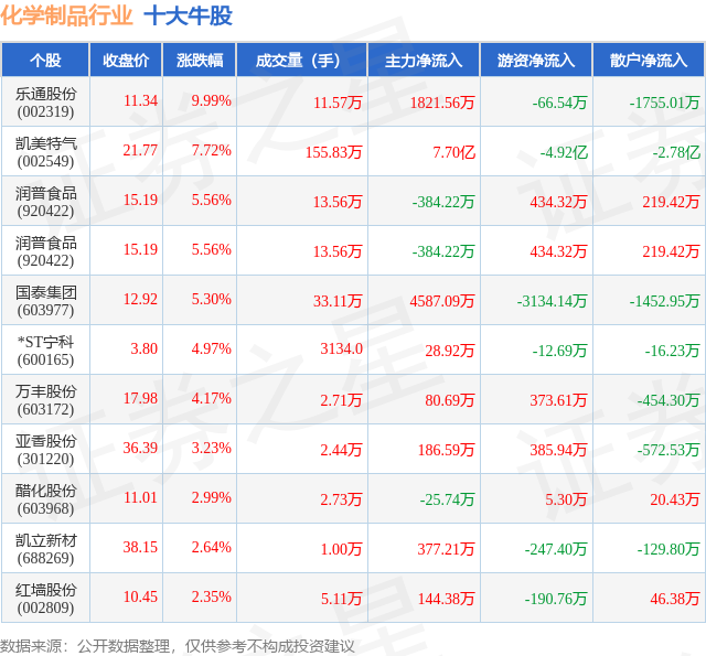 个股表现方面,化学制品行业当日领涨股为乐通股份(002319),该股当日报收11.34,上涨9.99%,成交量11.57万,主力资金净流入1821.56万元。凯美特气(002549)以上涨7.72%紧随其后,该股当日成交量155.83万,主力资金净流入7.7亿元。除此之外,润普食品(920422)、润普食品(920422)、国泰集团(603977)均进入当日牛股之列。具体个股列表见下表: