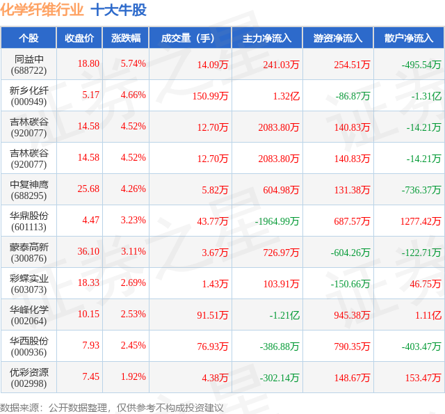 个股表现方面,化学纤维行业当日领涨股为同益中(688722),该股当日报收18.8,上涨5.74%,成交量14.09万,主力资金净流入241.03万元。新乡化纤(000949)以上涨4.66%紧随其后,该股当日成交量150.99万,主力资金净流入1.32亿元。除此之外,吉林碳谷(920077)、吉林碳谷(920077)、中复神鹰(688295)均进入当日牛股之列。具体个股列表见下表: