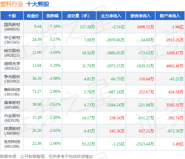 个股表现方面,塑料行业当日领跌股为国风新材(000859),该股当日报收9.44,下跌7.18%,成交量157.28万,主力资金净流出2.31亿元。中仑新材(301565)以下跌5.17%紧随其后,该股当日成交量7.08万,主力资金净流出2878.66万元。除此之外,纳尔股份(002825)、道明光学(002632)、争光股份(301092)均进入当日熊股之列。具体个股列表见下表: