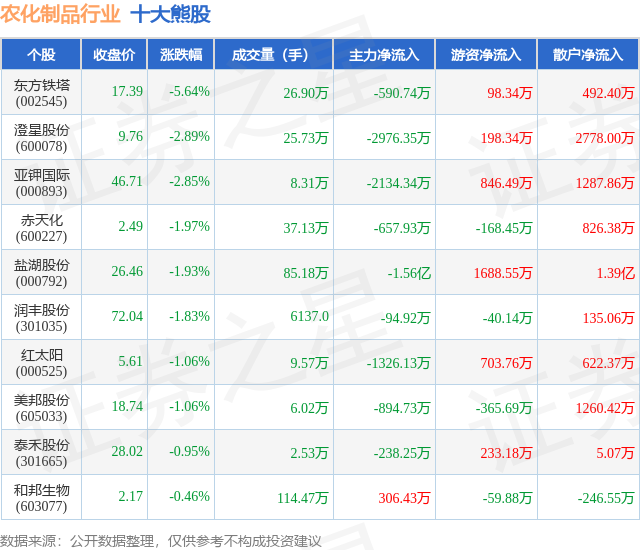 个股表现方面,农化制品行业当日领跌股为东方铁塔(002545),该股当日报收17.39,下跌5.64%,成交量26.9万,主力资金净流出590.74万元。澄星股份(600078)以下跌2.89%紧随其后,该股当日成交量25.73万,主力资金净流出2976.35万元。除此之外,亚钾国际(000893)、赤天化(600227)、盐湖股份(000792)均进入当日熊股之列。具体个股列表见下表: