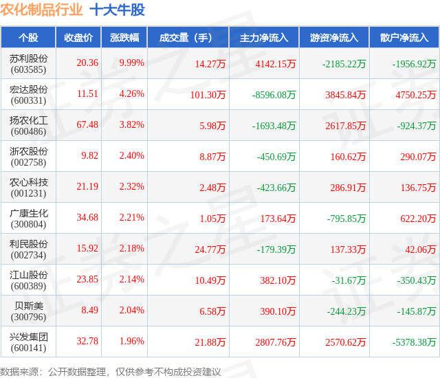 个股表现方面,农化制品行业当日领涨股为苏利股份(603585),该股当日报收20.36,上涨9.99%,成交量14.27万,主力资金净流入4142.15万元。宏达股份(600331)以上涨4.26%紧随其后,该股当日成交量101.3万,主力资金净流出8596.08万元。除此之外,扬农化工(600486)、浙农股份(002758)、农心科技(001231)均进入当日牛股之列。具体个股列表见下表: