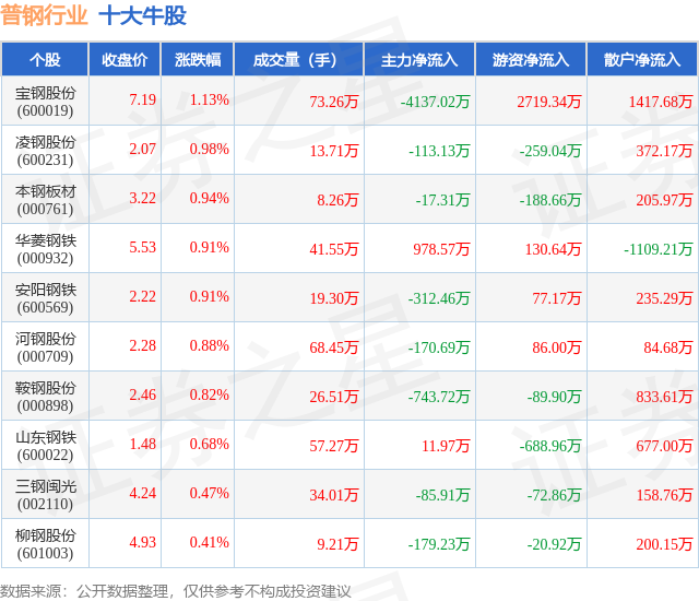 个股表现方面,普钢行业当日领涨股为宝钢股份(600019),该股当日报收7.19,上涨1.13%,成交量73.26万,主力资金净流出4137.02万元。凌钢股份(600231)以上涨0.98%紧随其后,该股当日成交量13.71万,主力资金净流出113.13万元。除此之外,本钢板材(000761)、华菱钢铁(000932)、安阳钢铁(600569)均进入当日牛股之列。具体个股列表见下表: