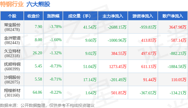个股表现方面,特钢行业当日领跌股为常宝股份(002478),该股当日报收7.9,下跌3.78%,成交量41.54万,主力资金净流出2688.15万元。金洲管道(002443)以下跌1.6%紧随其后,该股当日成交量9.6万,主力资金净流出1000.96万元。除此之外,久立特材(002318)、抚顺特钢(600399)、沙钢股份(002075)均进入当日熊股之列。具体个股列表见下表:
