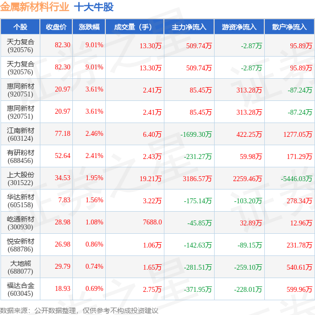 个股表现方面,金属新材料行业当日领涨股为天力复合(920576),该股当日报收82.3,上涨9.01%,成交量13.3万,主力资金净流入509.74万元。天力复合(920576)以上涨9.01%紧随其后,该股当日成交量13.3万,主力资金净流入509.74万元。除此之外,惠同新材(920751)、惠同新材(920751)、江南新材(603124)均进入当日牛股之列。具体个股列表见下表: