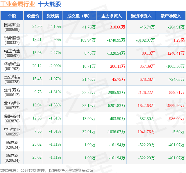 个股表现方面,工业金属行业当日领跌股为国城矿业(000688),该股当日报收24.3,下跌4.1%,成交量41.76万,主力资金净流入310.66万元。银邦股份(300337)以下跌2.9%紧随其后,该股当日成交量109.94万,主力资金净流出4740.95万元。除此之外,电工合金(300697)、华峰铝业(601702)、宜安科技(300328)均进入当日熊股之列。具体个股列表见下表: