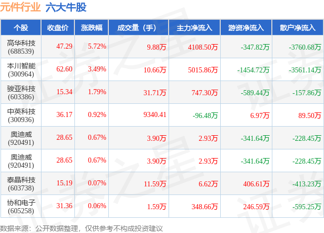 个股表现方面,元件行业当日领涨股为高华科技(688539),该股当日报收47.29,上涨5.72%,成交量9.88万,主力资金净流入4108.5万元。本川智能(300964)以上涨3.49%紧随其后,该股当日成交量10.66万,主力资金净流入5015.86万元。除此之外,骏亚科技(603386)、中英科技(300936)、奥迪威(920491)均进入当日牛股之列。具体个股列表见下表:
