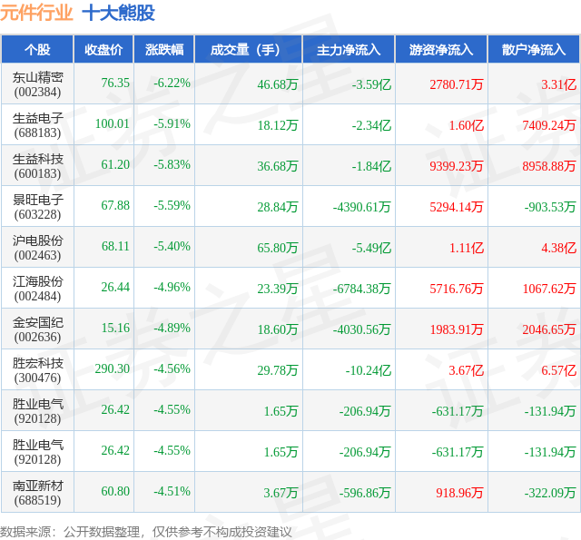 个股表现方面,元件行业当日领跌股为东山精密(002384),该股当日报收76.35,下跌6.22%,成交量46.68万,主力资金净流出3.59亿元。生益电子(688183)以下跌5.91%紧随其后,该股当日成交量18.12万,主力资金净流出2.34亿元。除此之外,生益科技(600183)、景旺电子(603228)、沪电股份(002463)均进入当日熊股之列。具体个股列表见下表: