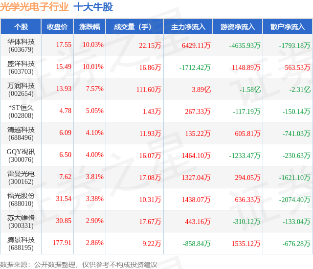 个股表现方面,光学光电子行业当日领涨股为华体科技(603679),该股当日报收17.55,上涨10.03%,成交量22.15万,主力资金净流入6429.11万元。盛洋科技(603703)以上涨10.01%紧随其后,该股当日成交量16.86万,主力资金净流出1712.42万元。除此之外,万润科技(002654)、*ST恒久(002808)、清越科技(688496)均进入当日牛股之列。具体个股列表见下表: