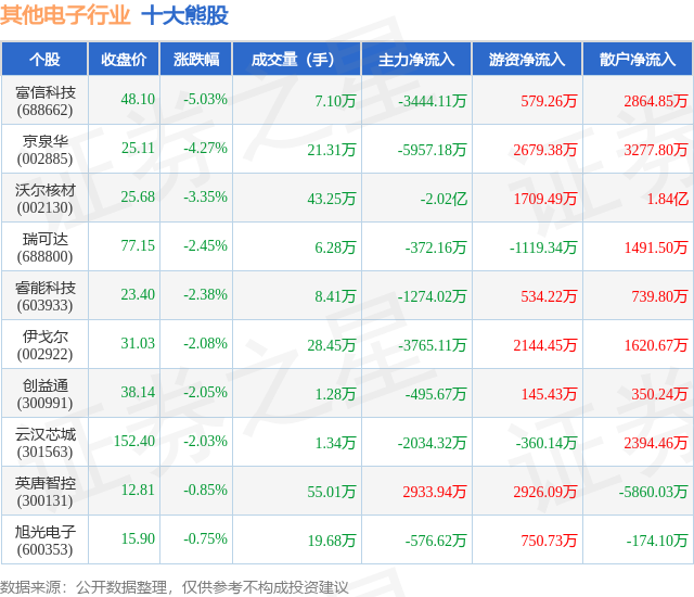 个股表现方面,其他电子行业当日领跌股为富信科技(688662),该股当日报收48.1,下跌5.03%,成交量7.1万,主力资金净流出3444.11万元。京泉华(002885)以下跌4.27%紧随其后,该股当日成交量21.31万,主力资金净流出5957.18万元。除此之外,沃尔核材(002130)、瑞可达(688800)、睿能科技(603933)均进入当日熊股之列。具体个股列表见下表: