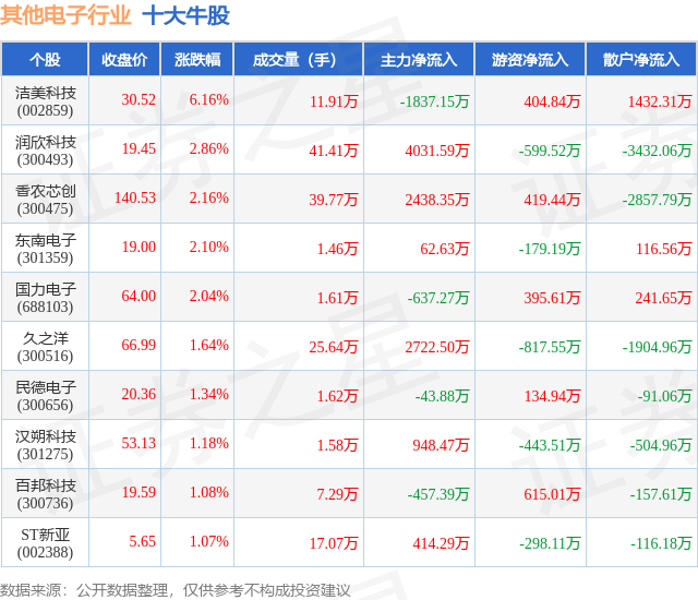 个股表现方面,其他电子行业当日领涨股为洁美科技(002859),该股当日报收30.52,上涨6.16%,成交量11.91万,主力资金净流出1837.15万元。润欣科技(300493)以上涨2.86%紧随其后,该股当日成交量41.41万,主力资金净流入4031.59万元。除此之外,香农芯创(300475)、东南电子(301359)、国力电子(688103)均进入当日牛股之列。具体个股列表见下表: