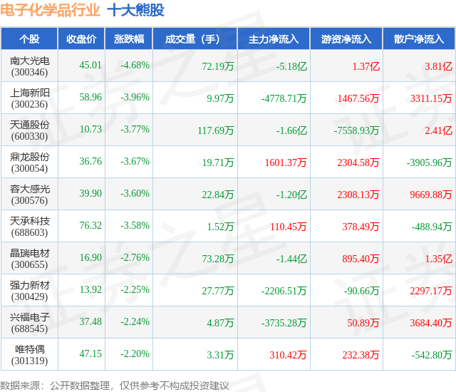 个股表现方面,电子化学品行业当日领跌股为南大光电(300346),该股当日报收45.01,下跌4.68%,成交量72.19万,主力资金净流出5.18亿元。上海新阳(300236)以下跌3.96%紧随其后,该股当日成交量9.97万,主力资金净流出4778.71万元。除此之外,天通股份(600330)、鼎龙股份(300054)、容大感光(300576)均进入当日熊股之列。具体个股列表见下表: