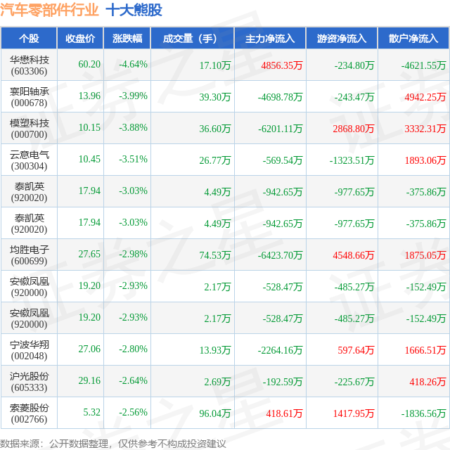 个股表现方面,汽车零部件行业当日领跌股为华懋科技(603306),该股当日报收60.2,下跌4.64%,成交量17.1万,主力资金净流入4856.35万元。襄阳轴承(000678)以下跌3.99%紧随其后,该股当日成交量39.3万,主力资金净流出4698.78万元。除此之外,模塑科技(000700)、云意电气(300304)、泰凯英(920020)均进入当日熊股之列。具体个股列表见下表: