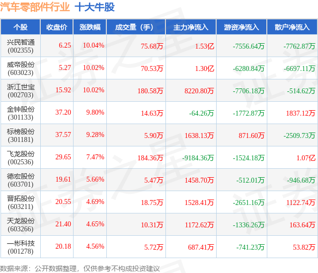 个股表现方面,汽车零部件行业当日领涨股为兴民智通(002355),该股当日报收6.25,上涨10.04%,成交量75.68万,主力资金净流入1.53亿元。威帝股份(603023)以上涨10.02%紧随其后,该股当日成交量70.53万,主力资金净流入1.3亿元。除此之外,浙江世宝(002703)、金钟股份(301133)、标榜股份(301181)均进入当日牛股之列。具体个股列表见下表: