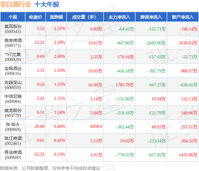 个股表现方面,非白酒行业当日领涨股为莫高股份(600543),该股当日报收5.52,上涨2.22%,成交量6.89万,主力资金净流出64.43万元。惠泉啤酒(600573)以上涨2.18%紧随其后,该股当日成交量19.61万,主力资金净流出847.86万元。除此之外,*ST兰黄(000929)、金枫酒业(600616)、古越龙山(600059)均进入当日牛股之列。具体个股列表见下表: